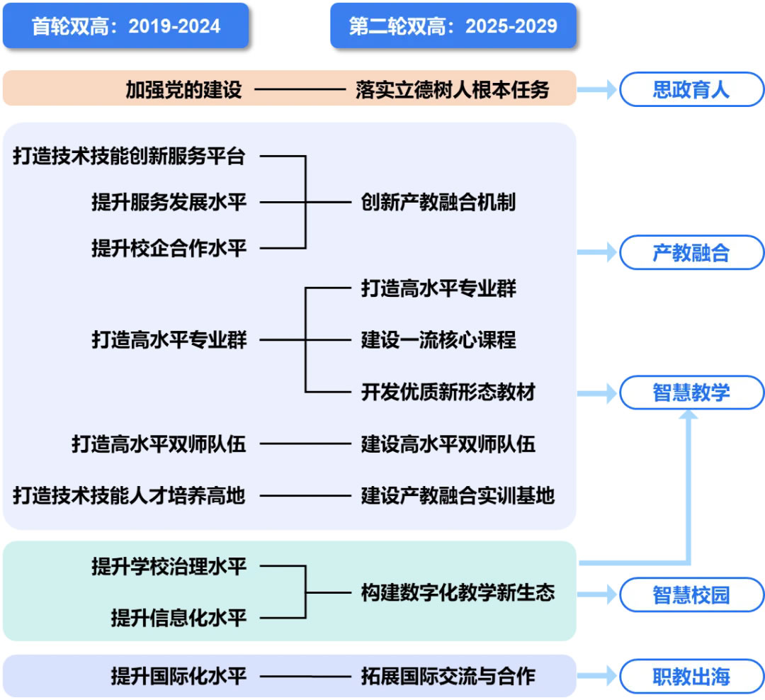 “双高计划”作为我国职业教育高质量发展的重要政策,其总体改革任务始终围绕着思政育人、产教融合、智慧教学、智慧校园、职教出海五个方向展开。首轮“双高计划”重在“提升水平”,通过5年建设,显著提高了职业院校的基础办学能力。在此基础上,第二轮“双高计划”进一步“建设体系”,构建更加完善的思政育人体系、产教融合共同体、“五金”建设体系、数字化教学生态和国际化发展格局,推动职业教育迈向高水平、高质量的新阶段。两轮“双高计划”一脉相承,既体现了职业教育改革的连续性,又展现了与时俱进的创新性。